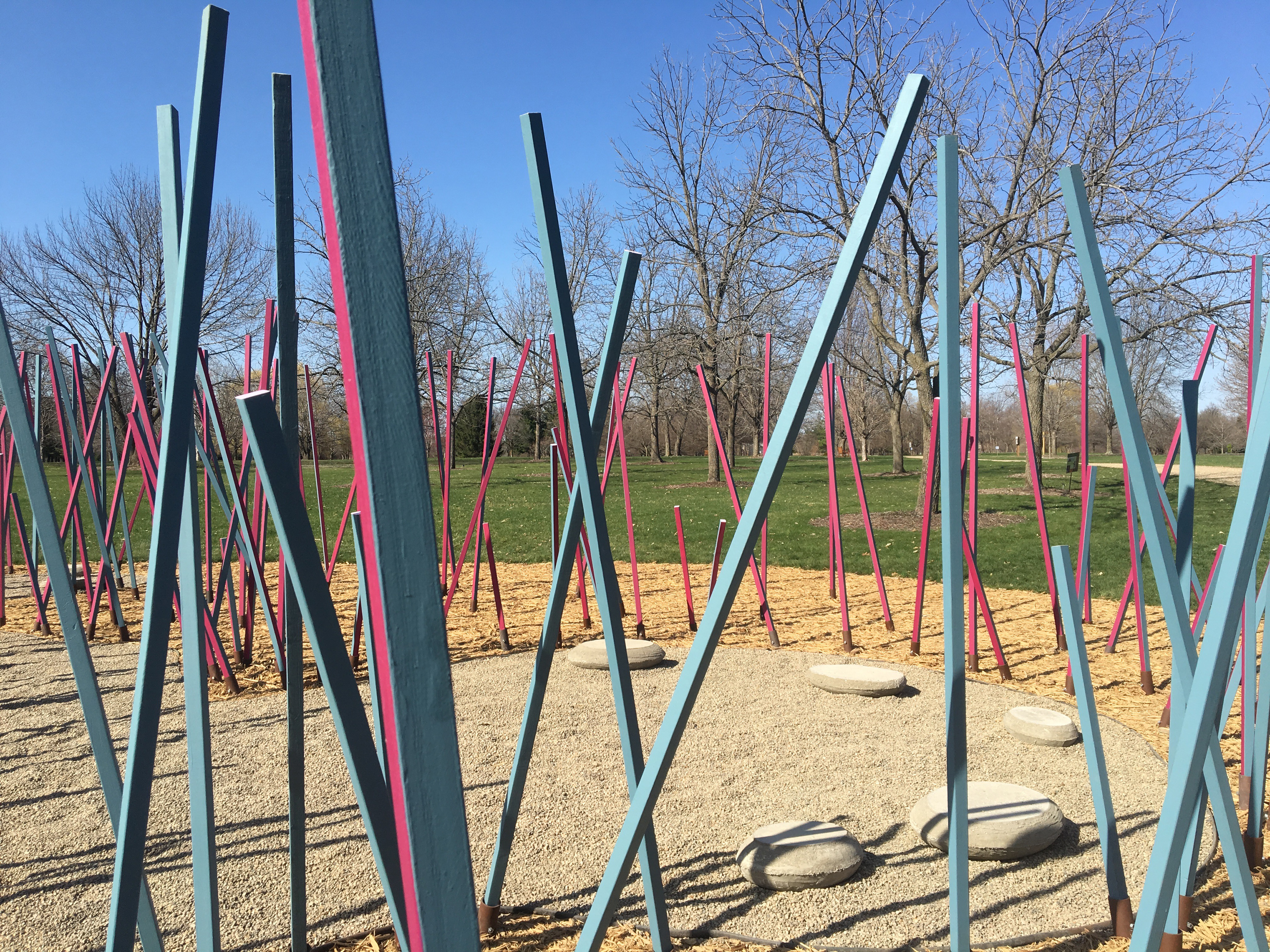 The overall form of the project consists of a cloud-like volume which contains three gathering spaces. Circulation paths and the void-like ‘rooms’ were drawn from site specific characteristics such as the existing pathways, trees, views, and topography. These paths and voids were then used to cull and disrupt the grid within the cloud. The result of these operations is a field of two hundred tall, thin poles occupying a base of mulch and a path of pea gravel. The palette is inspired by colors from the adjacent fields: shades of magenta and aqua define the lengths of the poles, while a lighter pink marks the top face, signifying the seed heads of the grasses. Each pole is painted to emphasize wayfinding and to define internal spaces and clusters of seating, with the magenta side of each pole turned to face the nearest path or room. The poles meet the ground at varying angles and orientations, creating a moiré effect and a feeling of movement reminiscent of tallgrasses swaying in the wind. Although the project was designed parametrically, the site pushed back against the imposition of “perfect parametrics”: snow, mud, rain, and frost resisted, and then relented, to the planting of this new type of tallgrass.