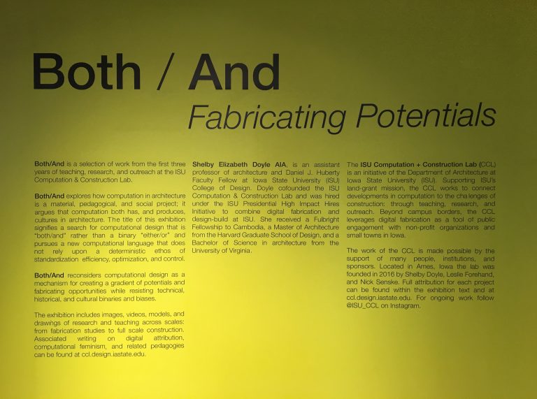 The exhibition includes images, videos, models, and drawings of research and teaching across scales: from fabrication studies to full scale construction. Associated writing on digital attribution, computational feminism, and related pedagogies can be found at ccl.design.iastate.edu.