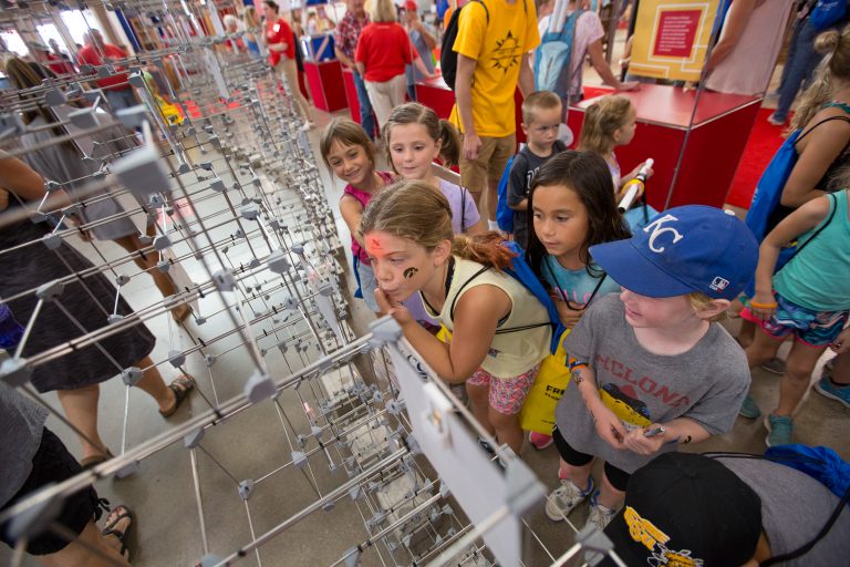 Kids look in the mirrors on IM_RU2, a 300-square-foot pavilion designed and built by design students at the Iowa State University exhibit at the 2018 Iowa State Fair. (Christopher Gannon/Iowa State University)