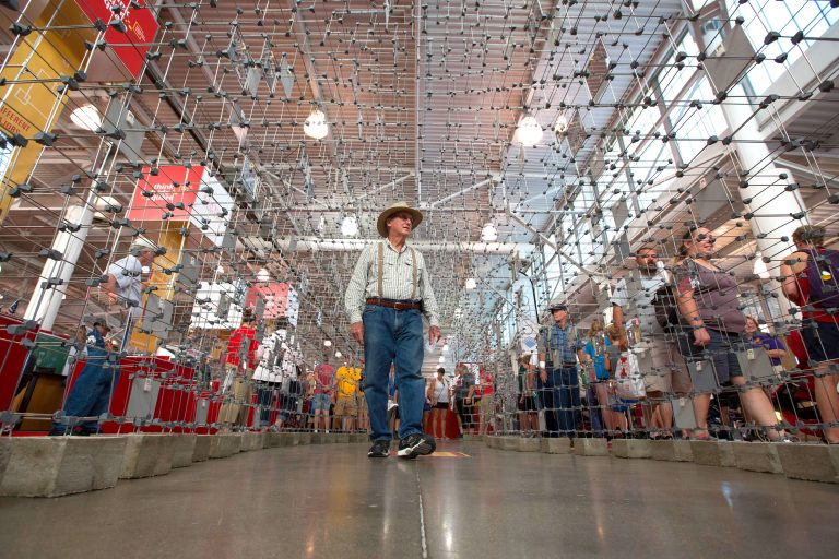 Dave Huber of Davenport walks through IM_RU2, a 300-square-foot pavilion designed and built by design students at the Iowa State University exhibit at the 2018 Iowa State Fair. (Christopher Gannon/Iowa State University)
