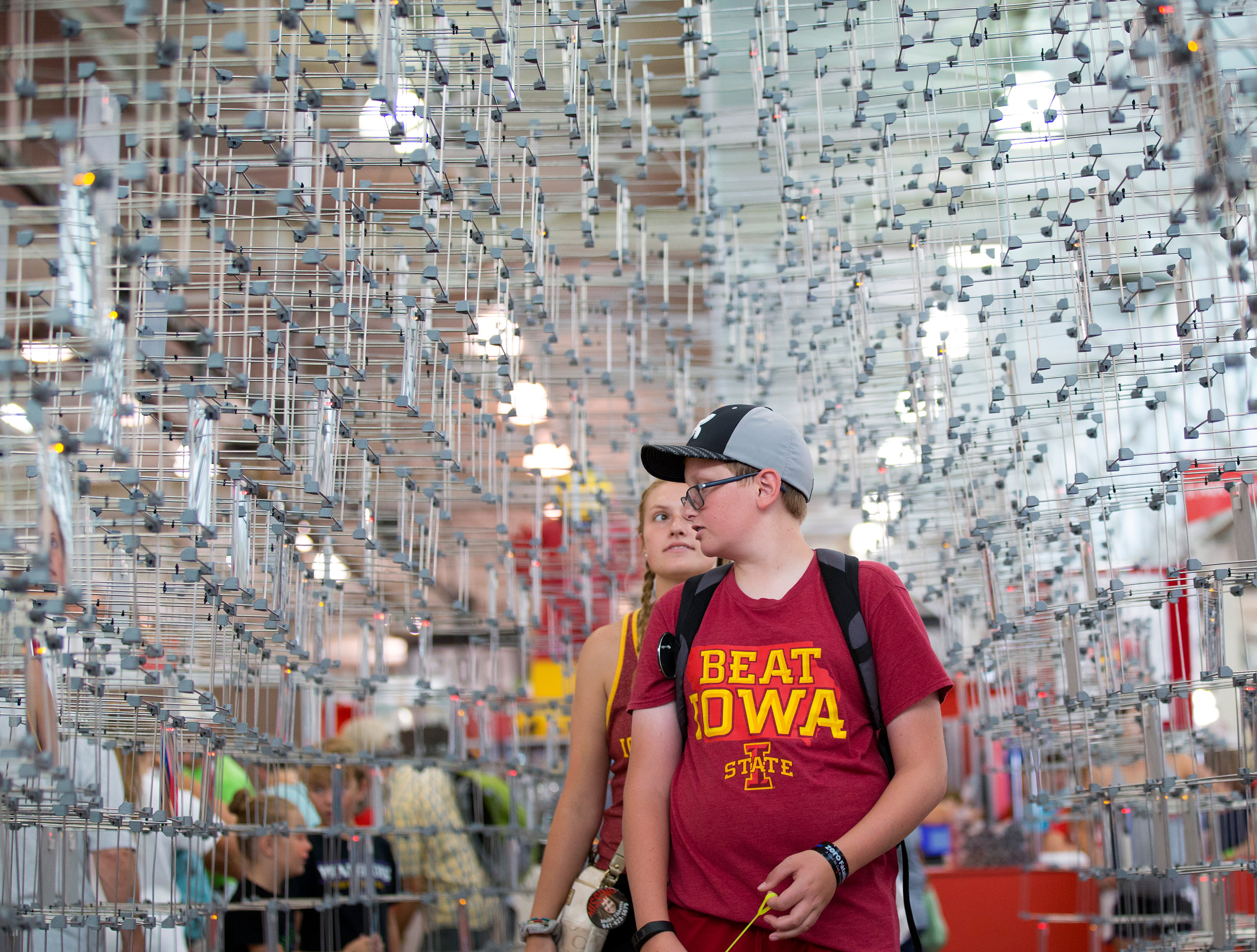 Kennedy Leonard, 5, right, of Lenox, walks through IM_RU2, a 300-square-foot pavilion designed and built by design students at the Iowa State University exhibit at the 2018 Iowa State Fair. (Christopher Gannon/Iowa State University)