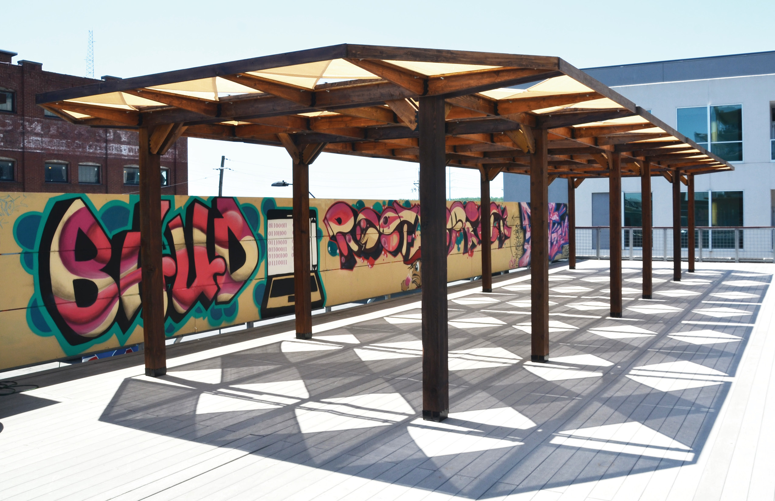 After assembling all of the necessary parts in Ames, the pieces were relocated to Des Moines for installation. The project shades over half of the 1800 square feet of the rooftop and provides the DMSC with a space that can be comfortably occupied and utilized to its fullest potential. PENUMBRA simultaneously enriches and enlivens the space of the rooftop by providing the organization the opportunity to expand their client base and offer more enjoyable events – during the spring, fall, and summer months, as the panels are easily designed and constructed to be removed and stored in the winter.