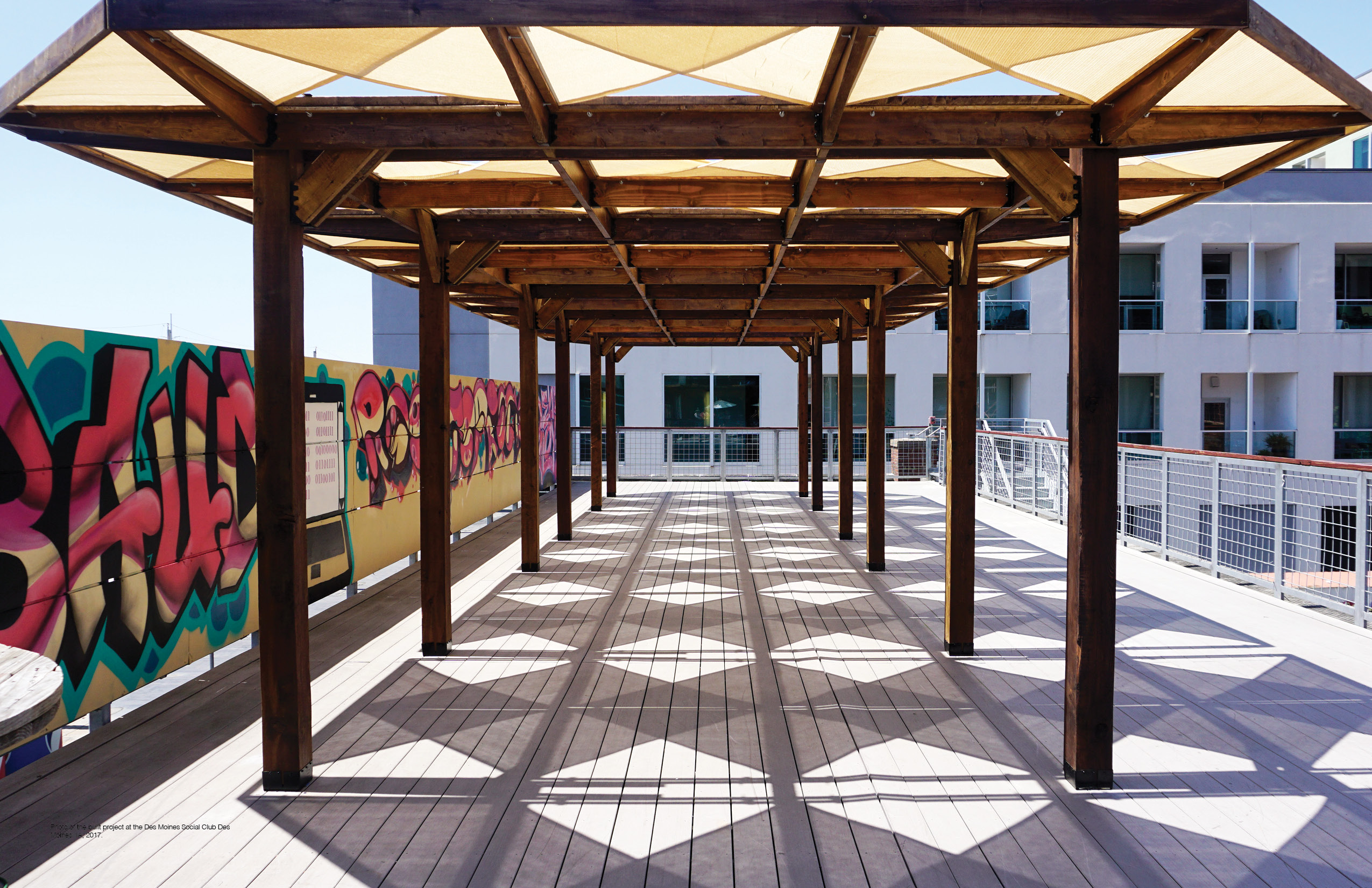 Each step required quick, iterative, reworking of the design. While the design went through nearly fifty iterations, the final design and build conveys the intent of the design team: to use the sun as a design tool, to create an open and flexible design, and to reflect the goals of the DMSC. The project relied upon an underlying grid of 42” drawn from the railing of the existing deck. This allowed the project to be easily constructed and maintained and allowed for flexibility. Constructed of wood and exterior grade shade cloth the project layers together solidity and softness of the fabric to create a layered shadow or PENUMBRA.