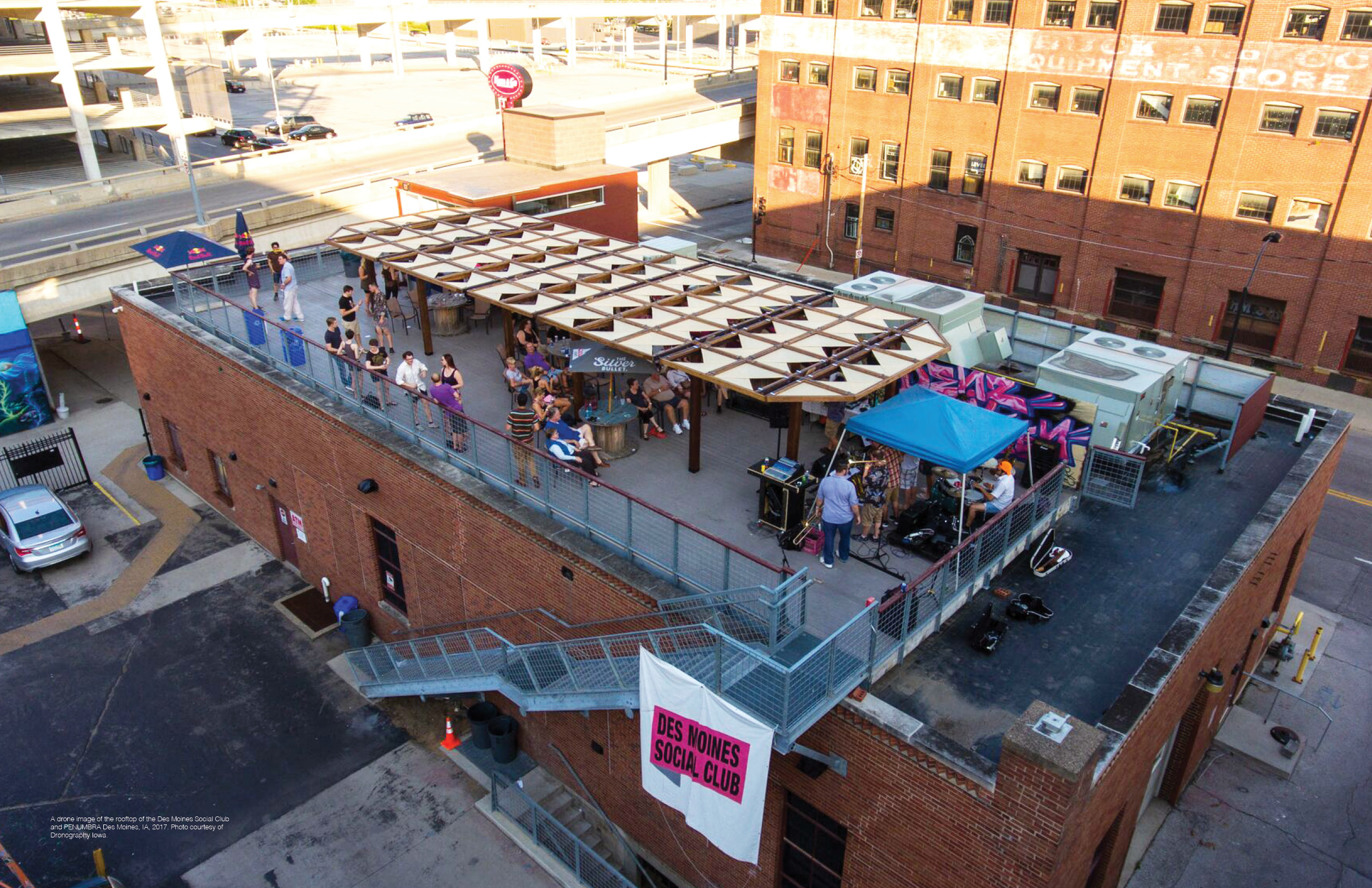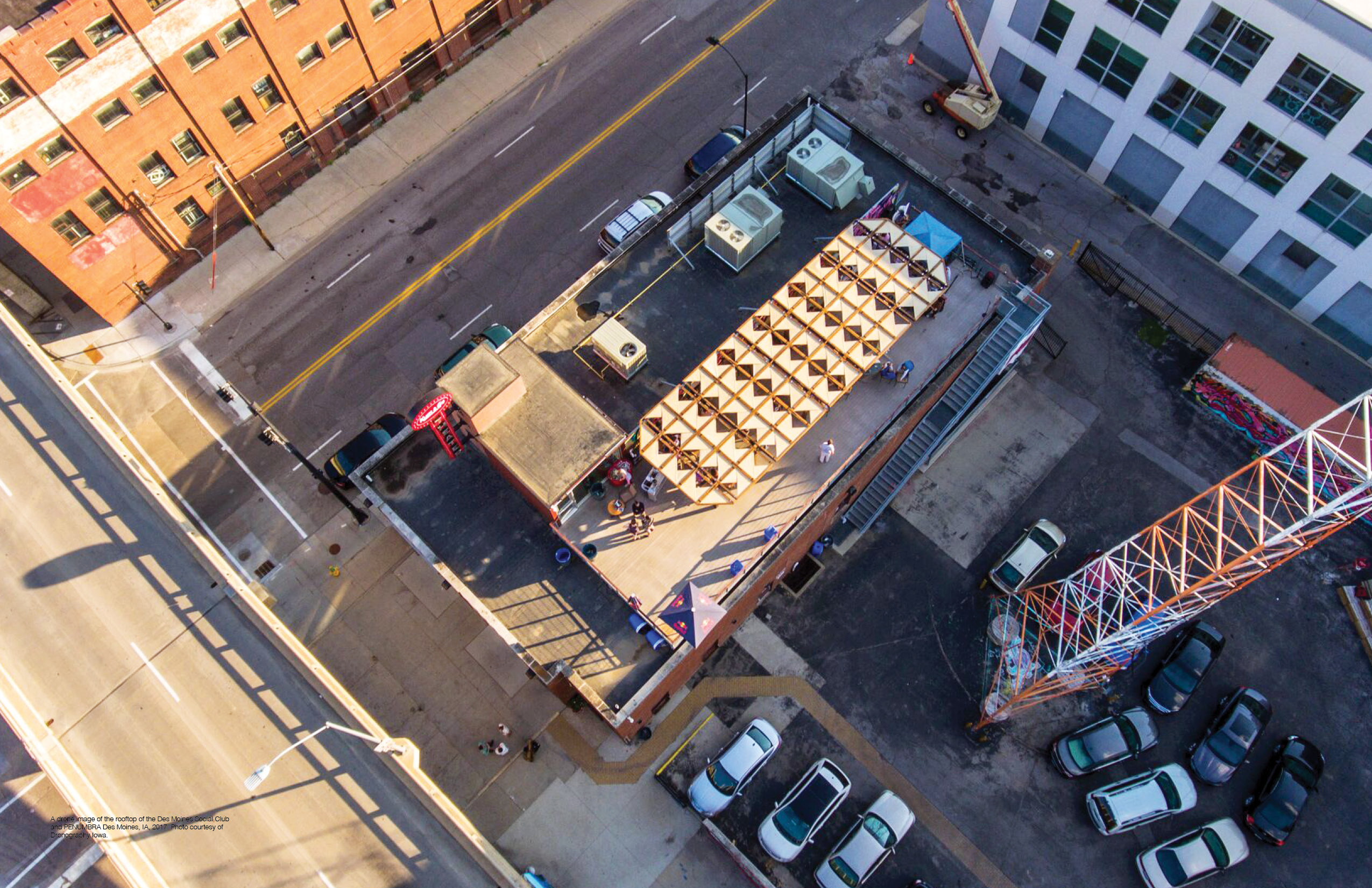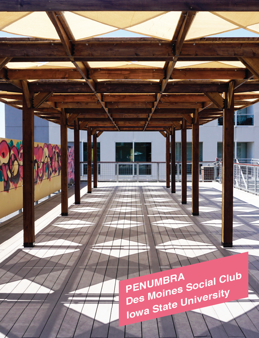 A PENUMBRA is the partially shaded outer region of the shadow cast by an opaque object and PENUMBRA is the name given to an 850 SF structure designed and constructed by twelve Iowa State University students on the roof of the Des Moines Social Club (DMSC) Kum & Go Theater. The project leveraged architectural design as a tool for community engagement and succeeded in expanding the usability of the rooftop – thus allowing the DMSC to enhance their potential for outdoor community activities. The DMSC is a non-profit organization which aims “to use the arts as a catalyst to create unprecedented community engagement” in Des Moines. The organization welcomes 25,000 visitors each month with a yearly revenue of $1.5 million for events ranging from gallery openings to rooftop theater performances and concerts.
