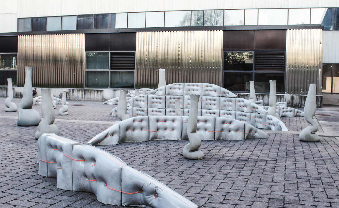 Throughout the semester, the twelve students in Doyle’s studio researched, tested, and designed concrete casting methods. PLUSH is the result of this work: a series of flowing objects that showcase a combination of low-tech and high-tech casting processes. Located in the King Pavilion courtyard on the north side of the College of Design, PLUSH invites users to engage with the exhibition through touch, dwelling, and moving through the space.